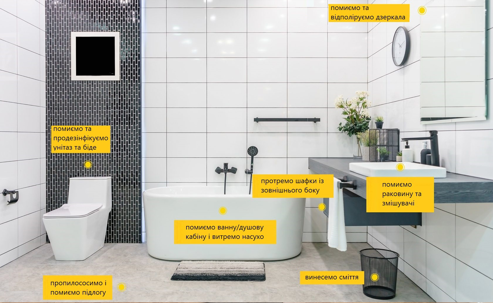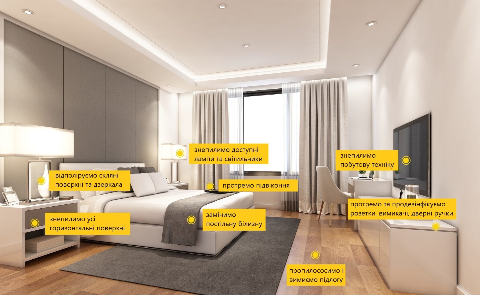 • Вологе прибирання всіх видів корпусних меблів (кришок столів, полиць, шаф, тумбочок) зовні.